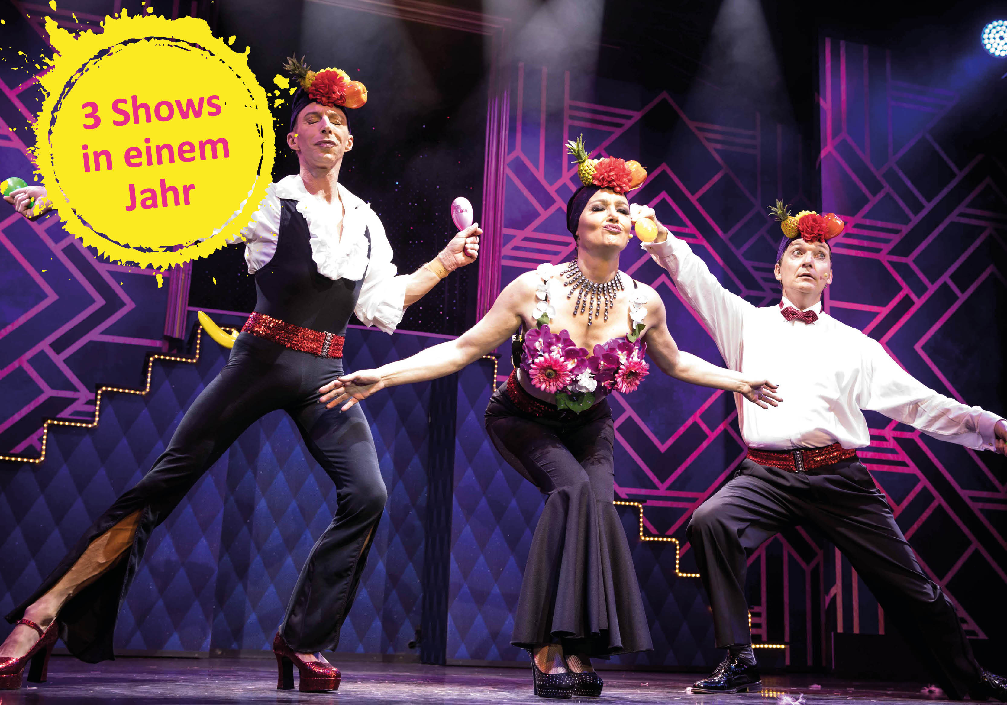 Genießen Sie drei Shows innerhalb eines Jahres, begleitet von einem prickelnden Begrüßungssekt und die Garderobe gibt es auch noch oben drauf!