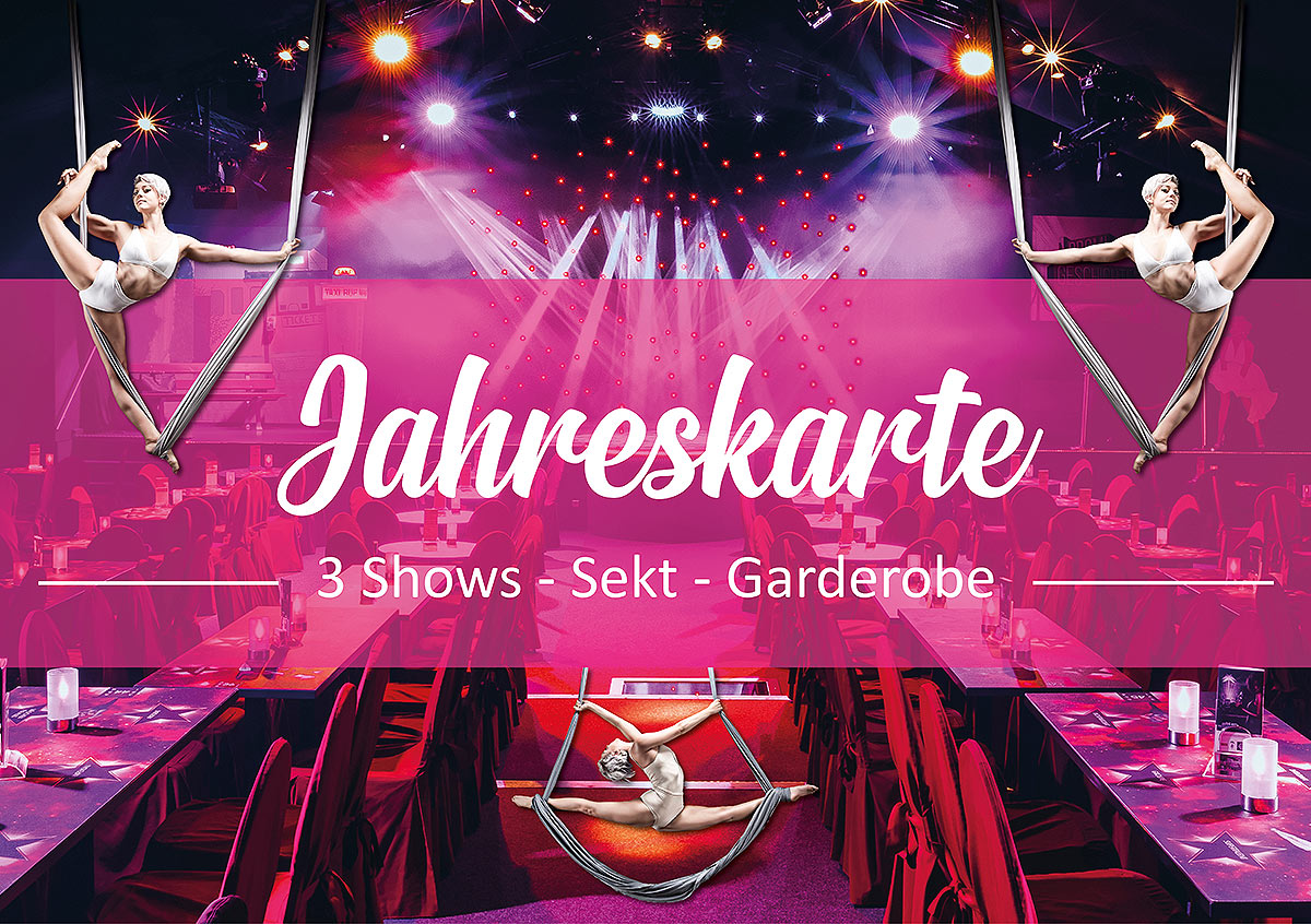 Die Jahreskarten sind an unserer Kasse und im Onlineshop erhältlich und ab dem Kaufdatum 12 Monate gültig. Sie haben somit die Möglichkeit, jede unserer drei Shows im Jahr einmal zu besuchen. Wann genau Sie Ihre Jahreskarte aber einlösen möchten, bleibt Ihnen überlassen. Sollte Ihnen z.B. eine Show ganz besonders gut gefallen und Sie haben noch zwei Showbesuche frei, dann könnten Sie ein und dieselbe Show auch bis zu 3x frei besuchen. Jeder Ihrer Showbesuche wird auf Ihrer Jahreskarte eingetragen und somit "abgestrichen".